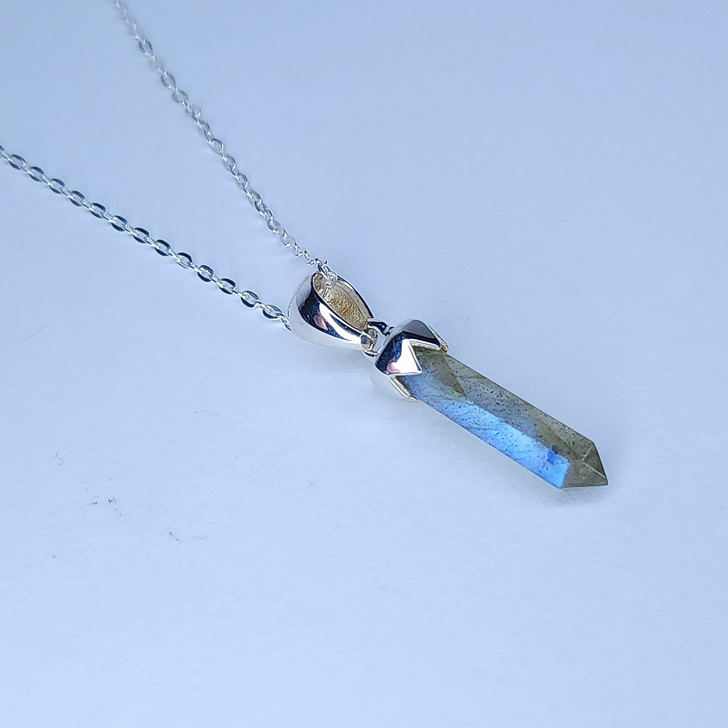 This Labradorite pendant features a dainty, polished point set in solid sterling silver. Each stone reveals beautiful flashes of blue, green, and gold — a natural phenomenon known as labradorescence — making every piece unique.